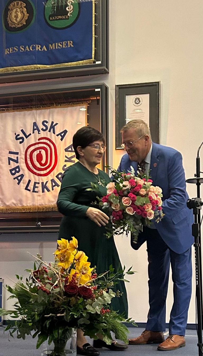 Prezes Okręgowej Rady Lekarskiej w Katowicach, dr n. med. Tadeusz Urban, skierował szczególne podziękowania do dr Frimety Kostman-Podsiedlik, wyrażając wdzięczność za wieloletnią, piękną współpracę oraz za to, że swoją postawą uczyła młodych lekarzy empatii wobec pacjentek.